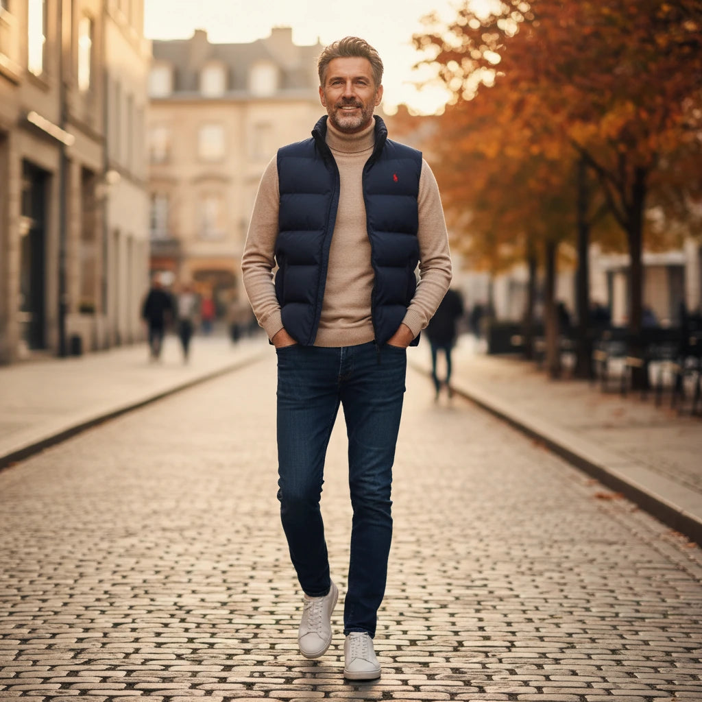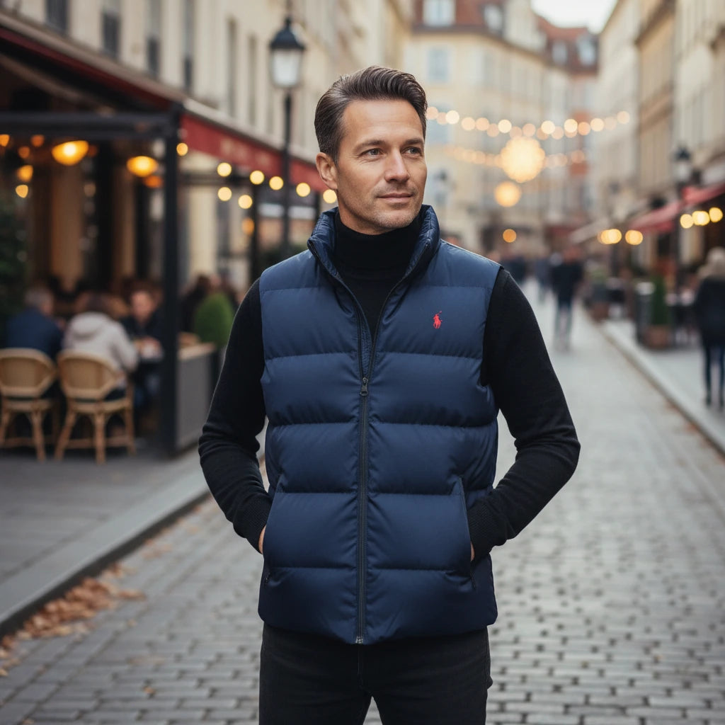 Vest Features: Modern fit, down & polyester for comfort and warmth, high collar, zip closure, side pockets, embroidered chest logo. Available in Navy Blue or Black, sizes M–4XL.